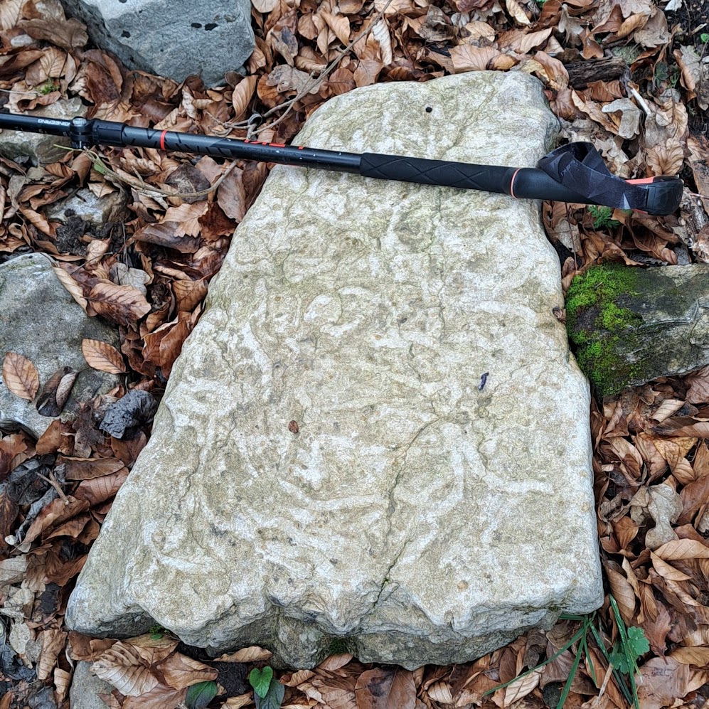 Le vallon, étroit et très encaissé, conserve les vestiges d’anciennes charbonnières, où l’homme avait exploité le bois des hêtres qui couvrent encore les pentes au dessus de nous. 2 km de pierres et de feuilles mortes et nous débouchons sur une piste. Nous rejoignons le village par des chemins traversant des sol maigres et érodés. Nous sommes à nouveau dans la garrigue, parfois directement sur la roche renfermant de fossiles de bivalves (du Miocène nous dira notre géologue). La vue s’ouvre et nous pouvons voir la Lance et les montagne du Nyonsais à l’est, mais pas grand-chose du Ventoux qui devrait se situé devant nous mais qui est noyé dans les nuages. Le ciel est chargé de tous les côtés sauf sur nos têtes où s’est ouvert un petit trou bleu.