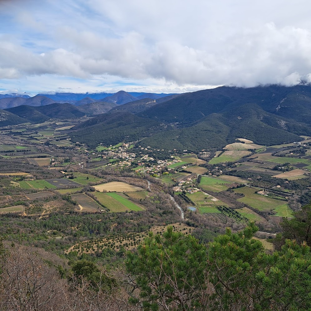 Nous garons les voitures au parking du Temple, et sous un soleil timide, nous partons vers le sud de la montagne du Rozier en suivant au départ un itinéraire balisé. Petites routes et sentiers dans la garrigue. Le sol érodé laisse à découvert la roche calcaire, et le chemin après la pluie de la nuit se transforme par endroits en ruisseau. Après 3 km nous commençons l’ascension vers la cime du Rozier droit au nord. La montée de 2 km dans le bois de chênes et de pins sylvestres est un peu monotone, mais nous sommes récompensés de nos efforts quand, près du sommet, la vue s’ouvre enfin sur la vallée du Lez. A nos pieds le village de La Roche Saint-Secret, en face de nous la Lance sous un chapeau de brume et vers le nord le pays de Dieulefit, fermé à l’horizon par les 3 Becs et Couspeau.