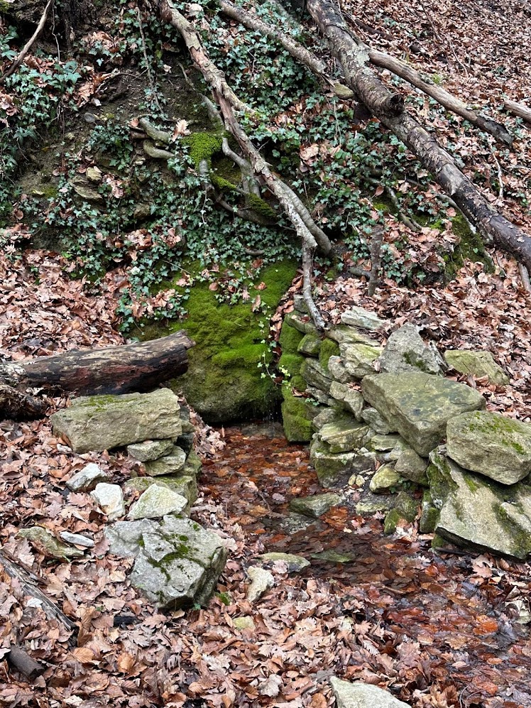Nous contournons le champ de lavandes au sud de la ferme pour plonger vers la fontaine de Charroux. Au creux d’un vallon planté de grands hêtres, l’eau sourd sous une pierre moussue.