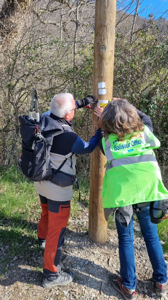 Après un temps pique-nique et un bon café, nous voilà repartis sur le sentier. Comme nous sommes 7, l’organisation se fait en deux groupes qui se suivent, se rattrapent, se dépassent pour aller de 400 m en 400 m jusqu’au col du Renard (940 m). Aline et Josette se relayant pour repeindre les marques jaunes, sur un arbre, un rocher ou un poteau afin d’orienter au mieux les futurs randonneurs.