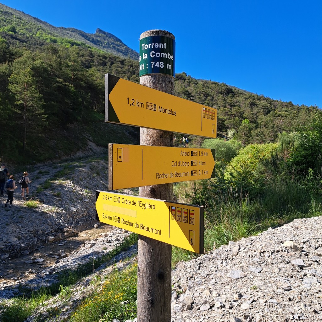 Départ de Montclus, hameau situé quelques kilomètres avant d’arriver à Serres (05). Une petite route rejoint le sentier de départ de la randonnée, au Torrent de la Combe, 748m. Un sentier monte d’abord tranquillement puis se fait plus raide pour arriver sur le crête.