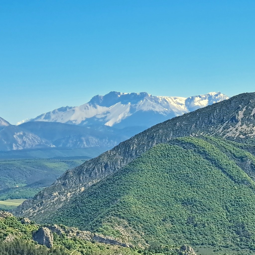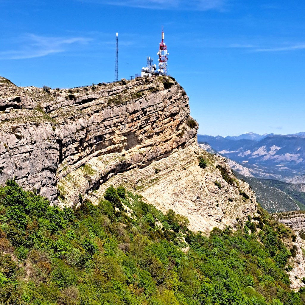 Le final de la montée est encore assez raide jusqu’aux antennes. Mais après l’effort, le bonheur de pouvoir profiter de ce point de vue à 1545m grâce à un petit sentier qui permet de contourner les antennes. la vue est encore plus vaste : les Écrins, Céüse, et les Pré-Alpes de Digne.