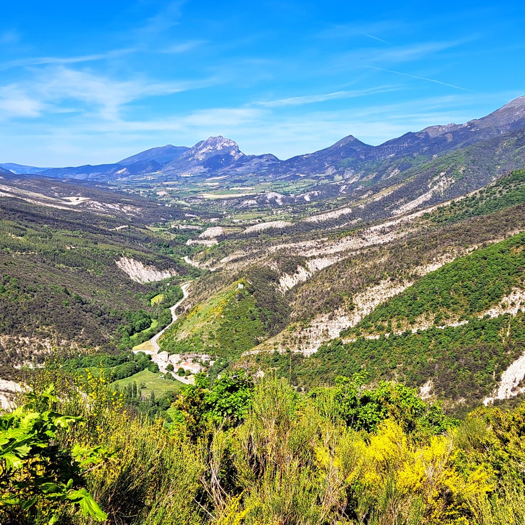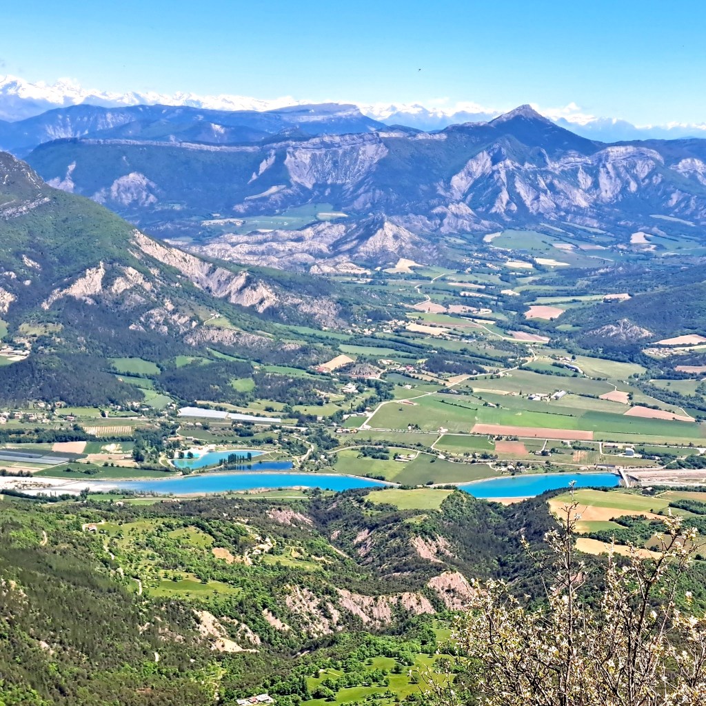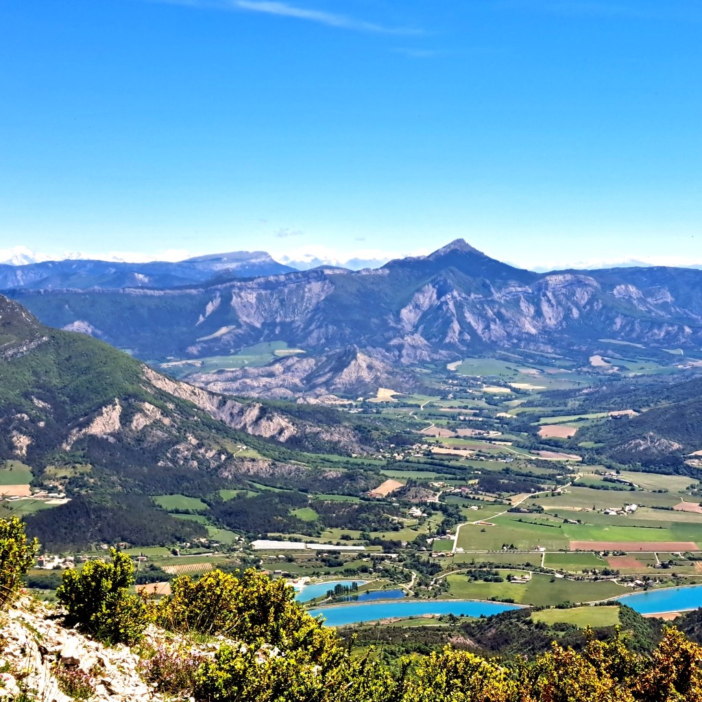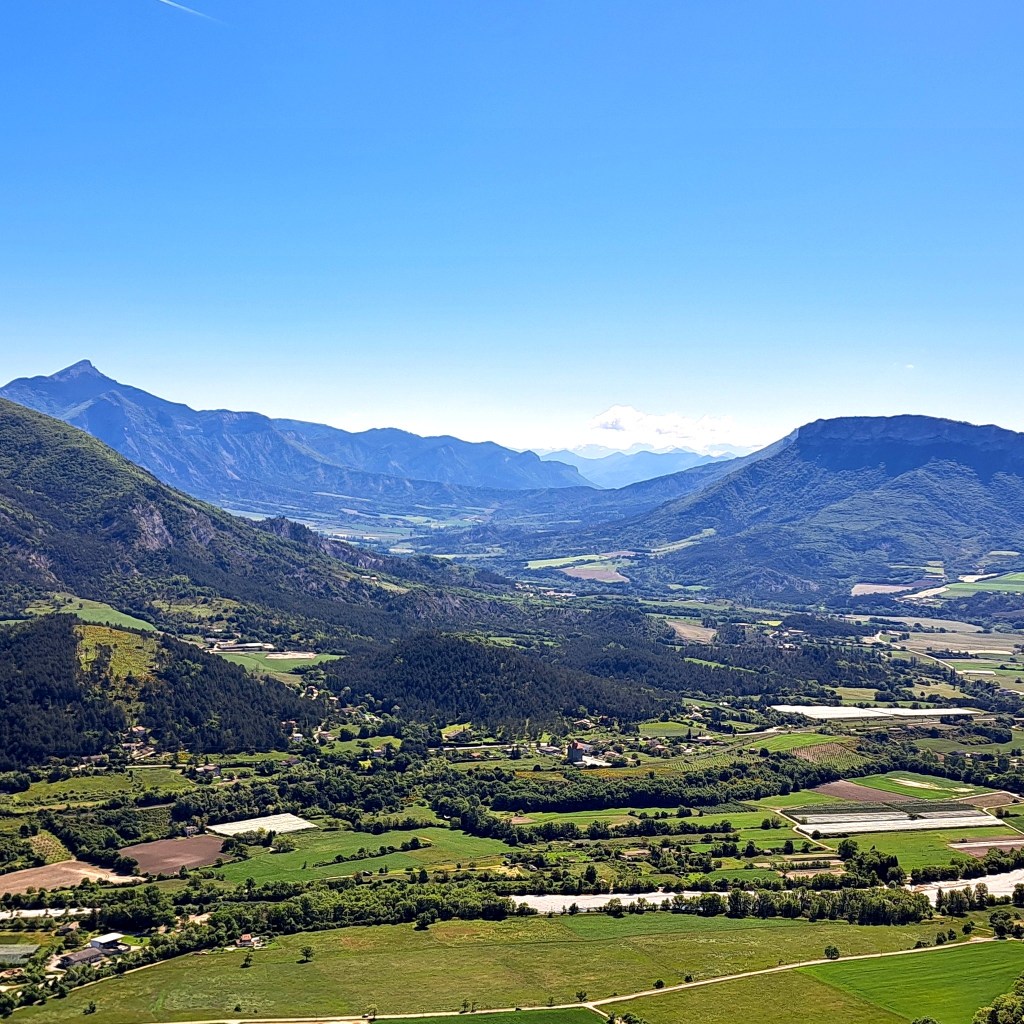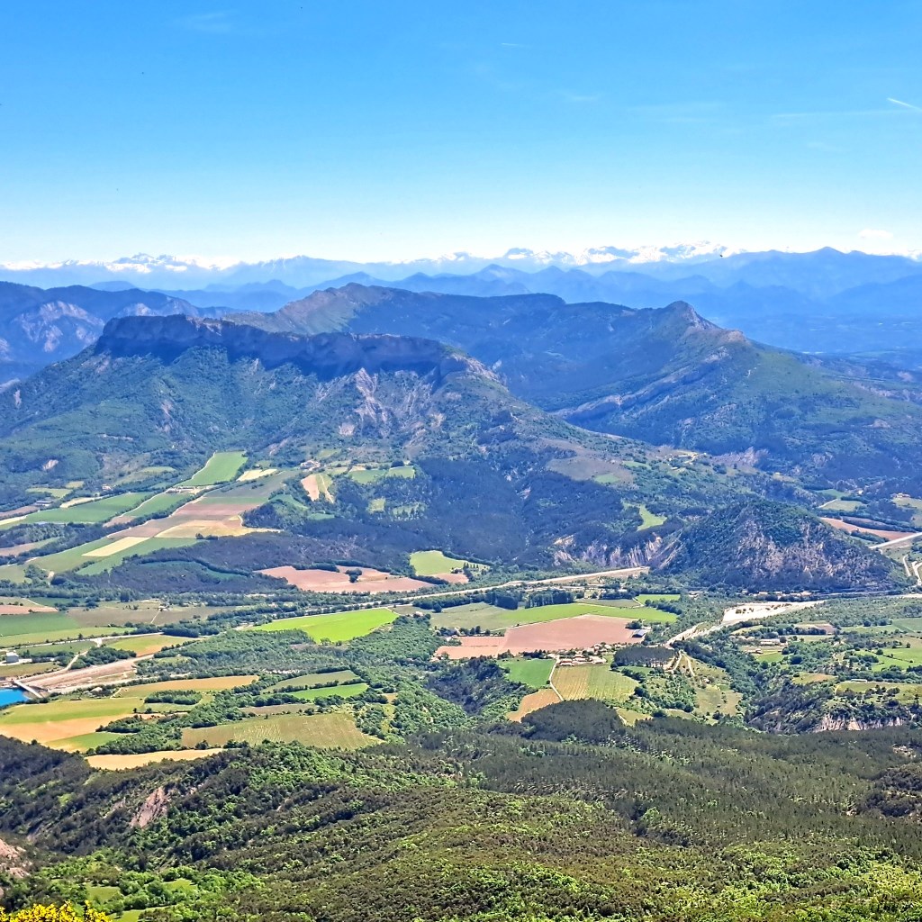 Là, le coup d’œil en vaut la peine : à l’ouest, les Baronnies Provençales et des sommets que nous connaissons bien : le Fourchat, le Duffre, le Bonnet rouge ; à l’est et au sud, une vue dominante sur Serres et le Mont Arambre, la vallée du Buëch et au fond les sommets du Dévoluy.