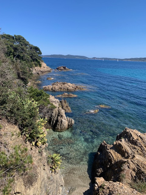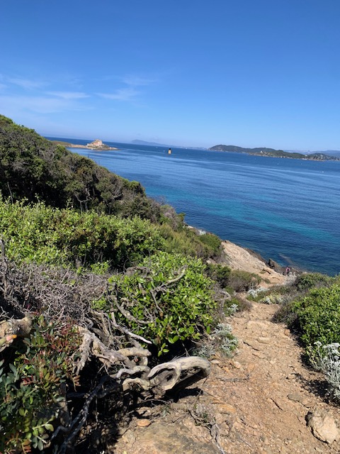 Jour 1 Départ de la tour fondue puis sentier côtier côté est de le presqu’île de Giens Le parcours est assez sportif et nous franchissons des escaliers un peu hauts ; heureusement, le paysage nous fait oublier l’effort!